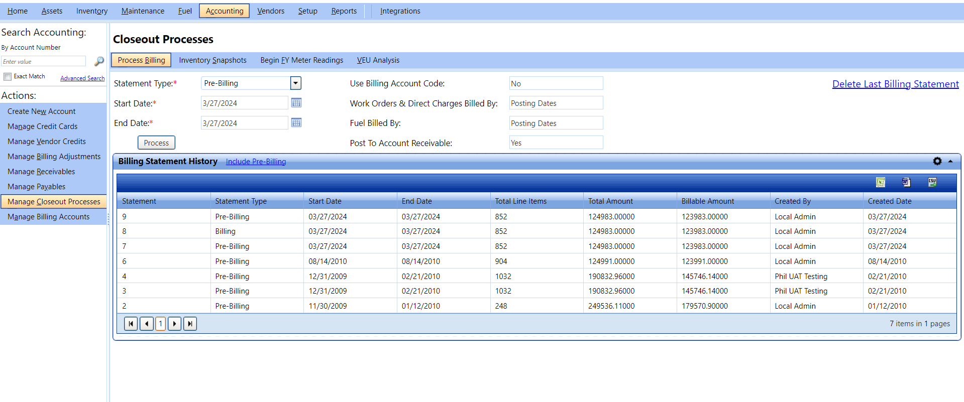 - A list of billings will appear when you click the Manage Closeout Processes link in the Action menu of the Accounting tab.
