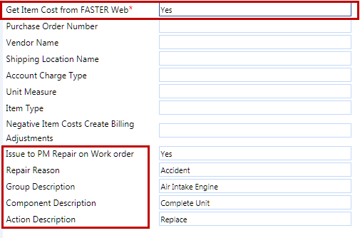 The following image highlights the fields that you must configure when the Get Item Cost from FASTER Web value is set to Yes: