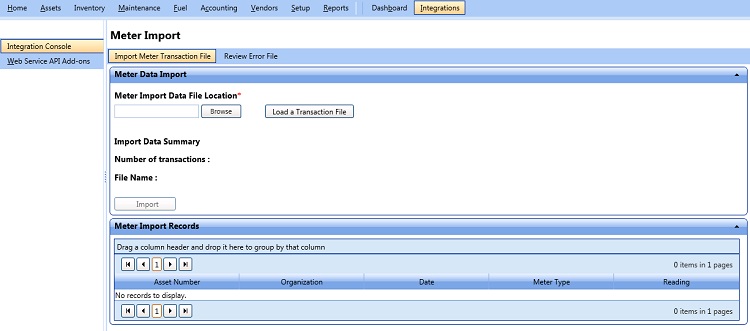 Note: The Meter Import Records grid display columns based on the Use Vinserial to map asset setting value. If the value is set to 'Yes', VIN/Serial Number column is displayed and if the value is set to 'No', Asset Number and Organization columns are displayed.